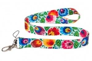 Smycz do kluczy w łowickie wzory ludowe . Folk smycz zdobią barwne kwiaty z łowickiej wycinanki na białym tle. Wzór na smyczy inspirowany jest tradycyjnym wzorem ludowym z regionu łowickiego. Elementem przewodnim na łowickich wycinankach są koguty, pawie oraz motywy kwiatowe.