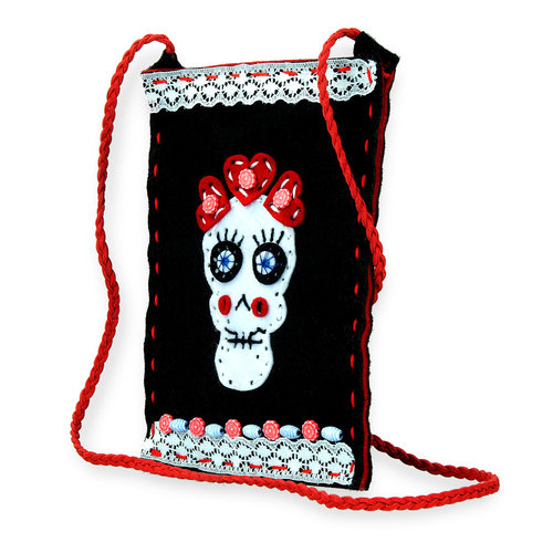 Czaszka Igraszka to kolorowe etui z rzemykiem posiadające bezpieczne zamknięciem na rzep. Przedstawia zabawną czaszkę na czarnym tle z otaczającymi ją serduszkami wokół głowy. Dostępne wymiary: 20 cm x 15 cm. Wszystkie elementy do samodzielnego przygotowania produktu znajdują się w zestawie: elementy filcowe z otworami ułatwiającymi szycie, elementy filcu samoprzylepnego, elementy dekoracyjne, plastikowa igła, zestaw zawiera czytelną i szczegółową instrukcję, ze wskazówkami projektantki, pokazującą wykonanie etui krok po kroku.