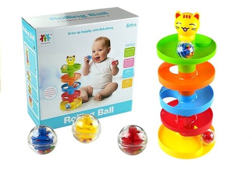 Edukacyjna zjeżdżalnia z kotkiem Kolorowy sorter z głową kotka na górze to bezkonkurencyjna zabawka dla każdego malucha. Nieskomplikowana zabawa w bardzo przyjemny i lekki sposób wpłynie na rozwój poszczególnych funkcji psychicznych dziecka. Edukacyjna zjeżdżalnia dla piłeczek została zaprojektowana z myślą o wszystkich maluchach powyżej 6. miesiąca życia. Zabawka składa się z podstawki, pięterek oraz trzech piłeczek. Wszelkie elementy wykonane są z certyfikowanego i atestowanego plastiku, który jest gwarancją bezpieczeństwa płynącego z zabawy. Sorter odznacza się bardzo opływowymi, delikatnymi kształtami, które będą niegroźne dla rączek malca. Na czym polega zabawa? Należy włożyć piłeczki do otworu znajdującego się w pierwszej platformie, a następnie pozwolić im swobodnie pokonywać pięterka i opadać w dół. Piłeczki wypadają otworkami znajdującymi się w każdym z poziomów, oznaczonymi numerkami 1, 2, 3, 4 i 5. Zabawka z pewnością zainteresuje każdego maluszka, dzięki czemu z dużą radością będzie chciał oglądać toczące się piłeczki. Jednak to nie wszystko — warto podkreślić, że jest to zabawka edukacyjna. Okrągłe piłeczki posiadają w środku grzechoczące elementy, co będzie stymulować słuch dziecka — wyostrzy go, a także rozwinie zdolność rozróżniania dźwięków. Kolorowe kuleczki posłużą również do ćwiczeń umiejętności łapania, a także rozwoju koordynacji i siły mięśni. Przyjemne dla oka, łagodne barwy zabawki, wpłyną na zmysł wzroku, natomiast delikatnie zaokrąglone kształty wywrą pozytywny wpływ na zmysł dotyku maluszka. Edukacyjna, wielofunkcyjna zabawka dla najmłodszych zapakowana jest w estetyczne pudełko utrzymane w jasnych barwach. Wymiary opakowania: 27 cm x 27 cm x 11 cm.