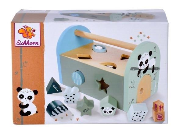 Drewniany sorter z klockami od firmy Eichhorn, to pudełko z rączką i dziewięcioma elementami w różnych kształtach i kolorach wykonane bardzo starannie z drewna brzozowego. Drewniana stabilna skrzynka sortera, pomieści wszystkie załączone klocki. Zabawa zestawem może stanowić zabawę jak również początek nauki kształtów i kolorów. Skrzynka posiada drzwiczki, dzięki którym w łatwy sposób można uzyskać dostęp do klocków.