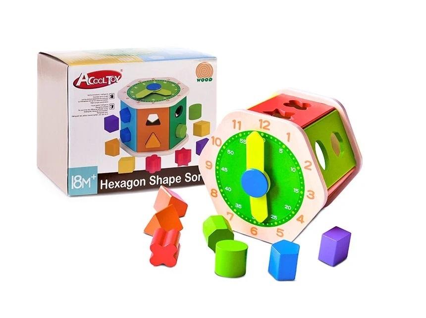 W zestawie: sorter 17 x 15,5 x 13 cm., Zegar, 12 klocków w różnych kształtach i kolorach, zabawa polega na dopasowaniu klocka do odpowiedniego otworu w sorterze, wym. Opk: 17,5 x 14,5 x 16 cm., 18m+