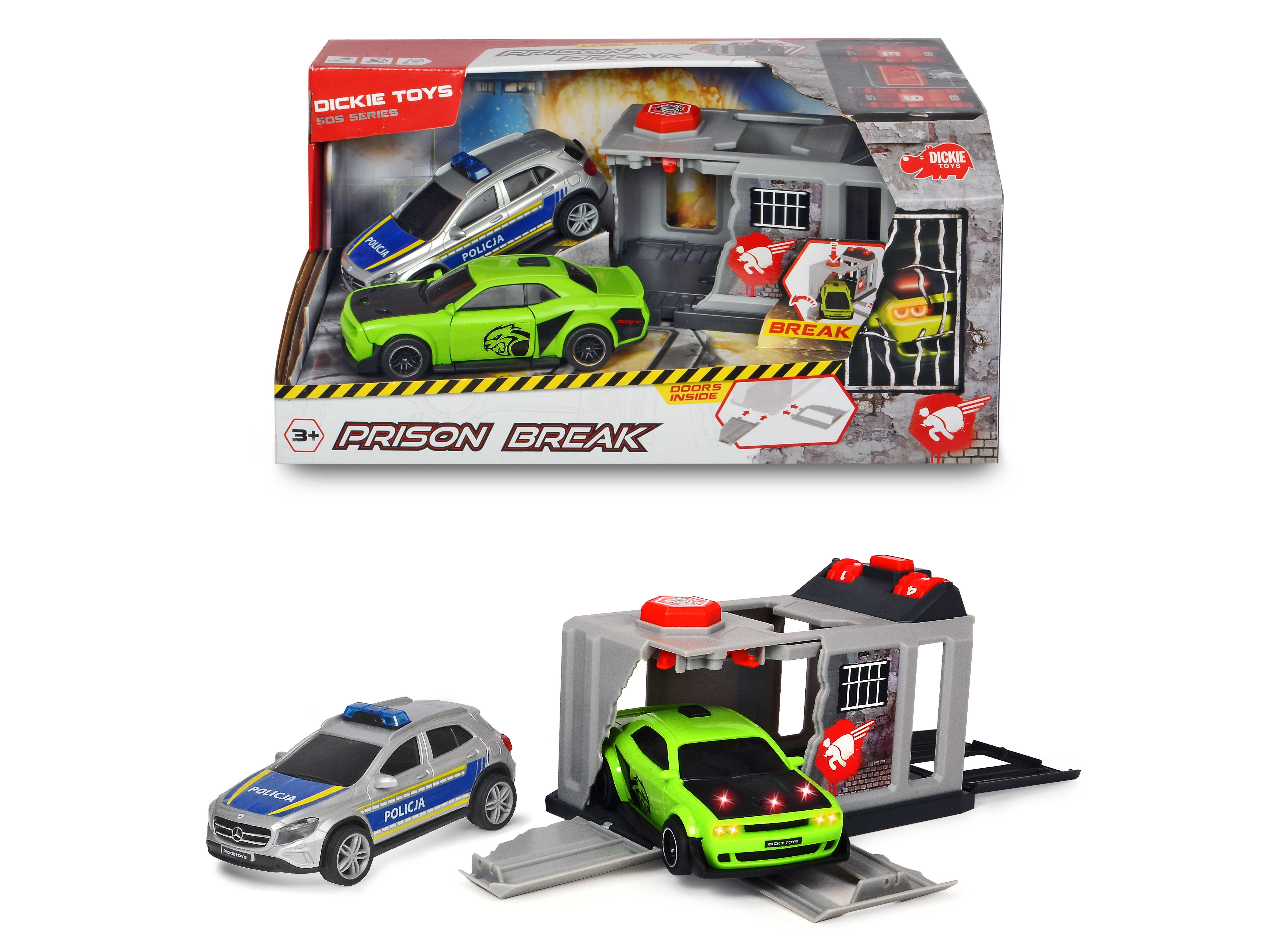 Zestaw Więzienie posiada klatkę z możliwością blokady, więzień może uciec z klatki tylnymi drzwiami, w zestawie: samochód bandyty z funkcją crash oraz światło i dźwięk, pojazd policyjny marki Mercedes, bez napędu, Tre Me, WERSJA POLSKA, baterie 3 x 1,5 V LR44 w zestawie.