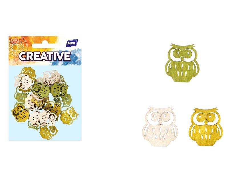 Dekoracja drewniana - świetna do wszelkich prac plastycznych. Można ją użyć do ozdabianie wianków i różnego rodzaju dodatków do wnętrz. Wykonana ze sklejki. Zapakowana w woreczek z zawieszką. Zestaw zawiera: - 24 szt. wycinanych sów