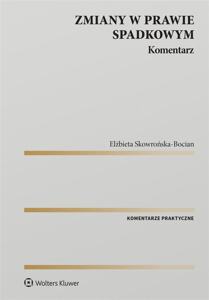 Komentarz zawiera omówienie zmian dokonanych w księdze IV Kodeksu cywilnego, a także w Kodeksie rodzinnym i opiekuńczym oraz w Kodeksie postępowania cywilnego dotyczących dziedziczenia ustawowego, niegodności dziedziczenia, sytuacji fundacji rodzinnej w obrębie uregulowań prawa spadkowego, zachowku, złożenia oświadczenia co do spadku w imieniu spadkobiercy niemającego pełnej zdolności do czynności prawnych oraz możliwości zrzeczenia się dziedziczenia na korzyść innej osoby, a także zachowku w całości lub w części. Książka zawiera zmiany legislacyjne wynikające z dwóch aktów: ustawy z 26.01.2023 r. o fundacji rodzinnej (Dz. U. poz. 326), która weszła w życie 22.5.2023 r oraz ustawy z 28.07.2023 r. o zmianie ustawy - Kodeks cywilny oraz niektórych innych ustaw (Dz. U. poz. 1615), która ustawa weszła w życie 15.11.2023 r. Paragraf Zmiany w prawie.png [6 KB]Nowelizacje te polegały w szczególności na: uzupełnieniu przesłanek niegodności dziedziczenia, ograniczeniu kręgu spadkobierców ustawowych, wprowadzeniu możliwości zawarcia umowy o zrzeczenie się dziedziczenia na korzyść innej osoby, dopuszczeniu możliwości zrzeczenia się tylko zachowku w całości lub w części, uzupełnieniu przepisów o zachowku w związku z uchwaleniem ustawy o fundacji rodzinnej. Adresaci.jpg [8 KB]Publikacja jest przeznaczona dla praktyków: sędziów, adwokatów, radców prawnych, notariuszy, a także dla pracowników naukowo-dydaktycznych oraz studentów wydziałów prawa.