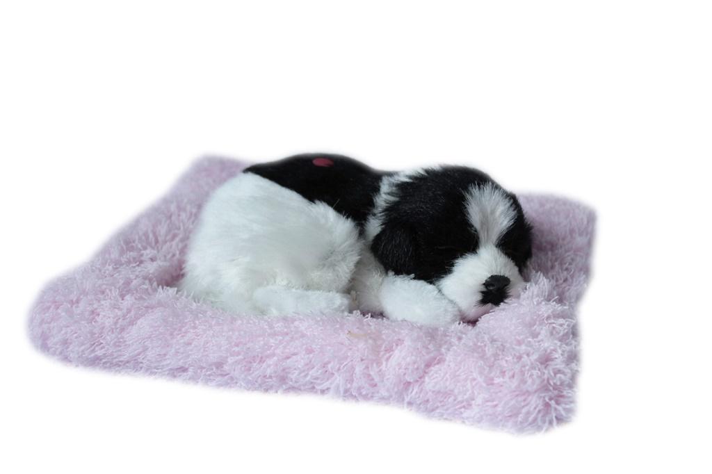 Uroczy biało czarny, śpiący piesek na poduszce będzie znakomitym prezentem dla najmłodszych jak i wszystkich wielbicieli domowych pupili.