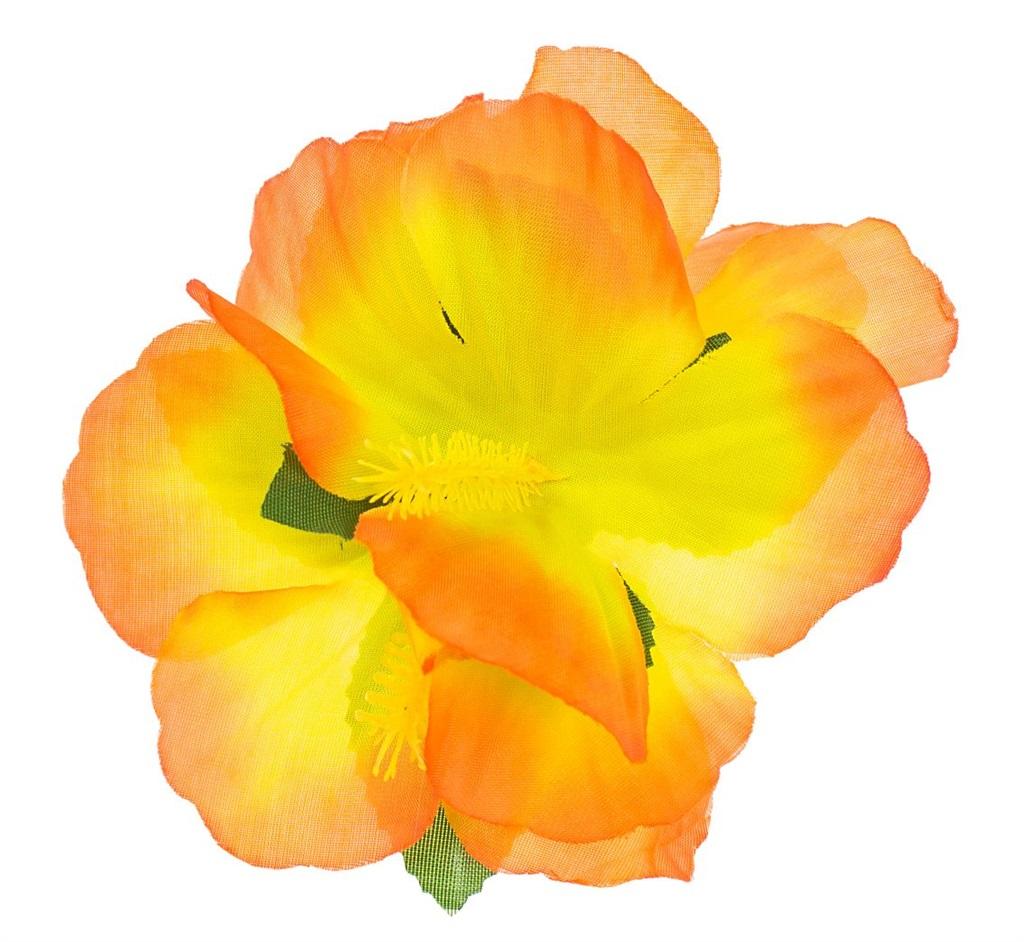 SPINKA HAWAJSKA DUŻA POMARAŃCZOWA Długość spinki: 7,5 cm Średnica kwiatka: 12 cm Przypinka z kwiatami w kolorze pomarańczowo - żółtym i zielonymi listkami. Mocowana na różowej spince typu "żabka". Kwiaty materiałowe, spinka plastikowa.