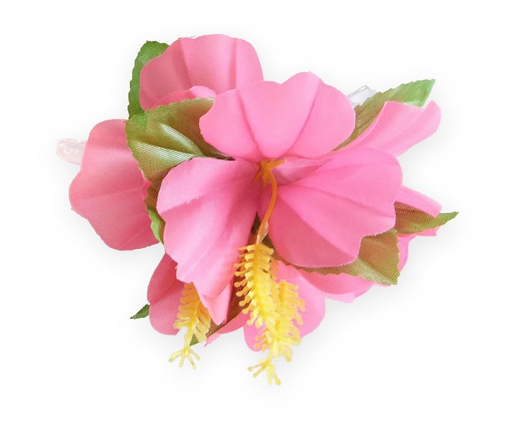PRZYPINKA HAWAJSKA DUŻA Długość spinki: 11,5 cm Szerokość kwiatów: 10,5 cm Przypinka z kwiatem w barwie różowej i listkami. Mocowana na przeźroczystej spince typu "żabka" Kwiaty materiałowe, spinka plastikowa