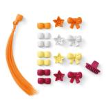 8 x koraliki do włosów, 4 x kwiat do włosów, 4 x kokarda do włosów, 1 x pasmo włosów, 1 x grzebień na palec.