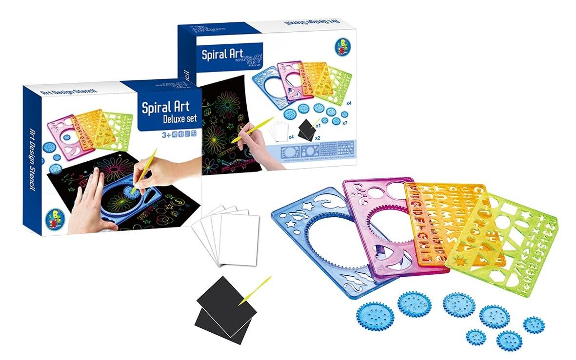 W zestawie: 7 x szablon spirograf, 1 x rysik, 4 x arkusz papieru; funkcje: zestaw umożliwia rysowanie geometrycznych i symetrycznych wzorów spiralnych oraz krzywych za pomocą obracających się kół zębatych wewnątrz szablanów; wym. opakowania: 29 x 22 x 5 cm; 3+