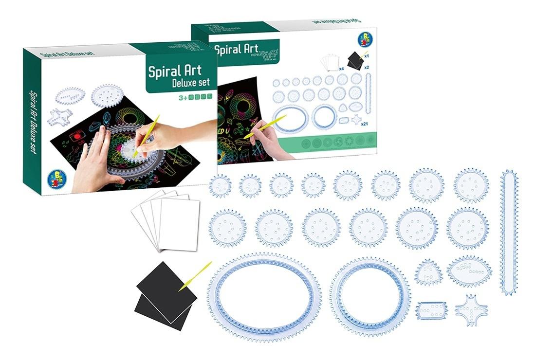 W zestawie: 21 x szablon spirograf, 1 x rysik, 6 x arkusz papieru; funkcje: zestaw umożliwia rysowanie geometrycznych i symetrycznych wzorów spiralnych oraz krzywych za pomocą obracających się kół zębatych wewnątrz szablanów; wym. opakowania: 29 x 22 x 5 cm; 3+