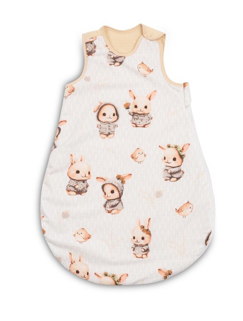 Śpiworek do spania będzie służył dzieciom już od pierwszych dni życia (0-9 miesięcy) zapewniając im ciepło i bezpieczeństwo. Uszyty jest z miękkiej bawełny wypełnionej otuliną. Wnętrze i tył śpiworka są wykonane z bawełny muślinowej. Produkt nie zawiera twardych elementów, które mogłyby podrażnić skórę dziecka. Wyposażony jest w dwustronny zamek błyskawiczny, poprowadzony wokół śpiworka, pozwalający na zmianę pieluchy bez wyciągania dziecka ze śpiworka.