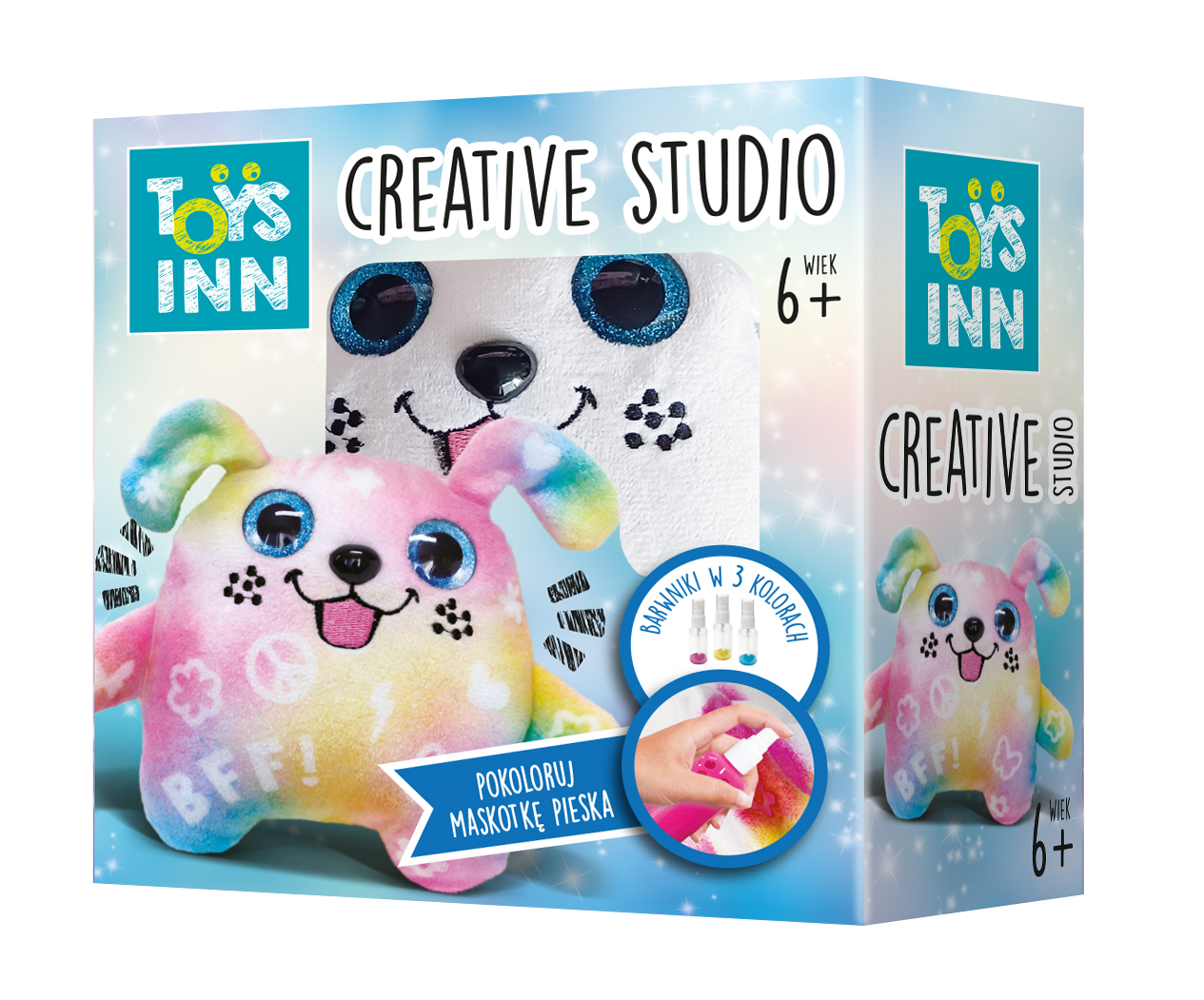Zestaw kreatywny SPRAY DYE Toys Inn do samodzielnego ozdobienia maskotki Pieska. W skład zestawu wchodzą: maskotka o wymiarach 15 x 14 cm oraz barwniki w 3 kolorach (różowy, żółty, niebieski) w pojemnikach z atomizerem.