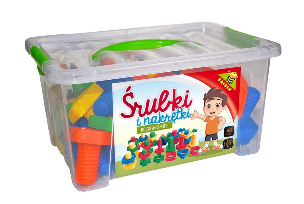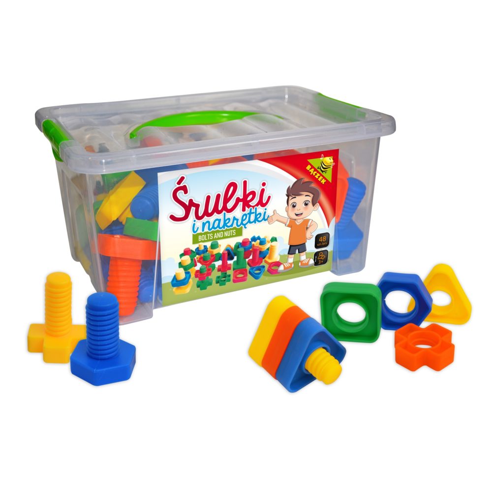Zestaw śrub i nakrętek zawierający 48 elementów. W zestawie znajdują się 24 śruby i 24 nakrętki w 4 kolorach o 4 różnych formach (trójkąt, kwadrat, sześciokąt, krzyżak). Aby odpowiednio dobrać nakrętkę do śruby należy znaleźć podstawę śruby o takim samym kształcie. Zestaw daje wiele możliwości zabawy – elementy można sortować według koloru, kształtu a także można dopasowywać odpowiednią nakrętkę do śruby wg koloru lub kształtu. W czasie zabawy dziecko ćwiczy umiejętność logicznego myślenia oraz trenuje koncentrację. Zabawka świetnie rozwija motorykę małych rączek.