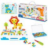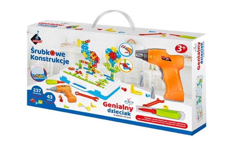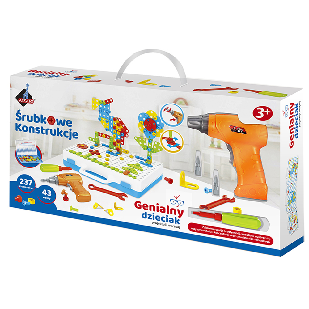 śrubokręt, wiertarkę, śrubki, podkładki, elementy geometryczne, łączniki.Zestaw zawiera praktyczną walizkę, dzieki której wszystkie elementy bedą zawsze na miejscu. Zasilanie 2xAA (brak w zestawie)