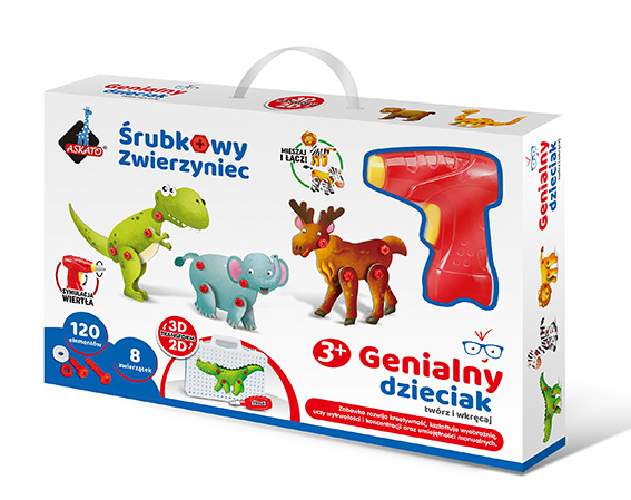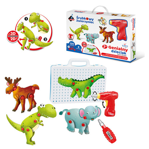 Śrubkowy Zwierzyniec Mozaika, która pobudza myślenie przestrzenne, rozwija kreatywność i widzenie symetrii. Mały konstruktor przykręcając śrubki ćwiczy grafomotorykę swojej rączki - przez zabawę przygotowuje się w przyjemny sposób do trudnej sztuki pisania. Po krótkim treningu przykręcania zwierzątek na planszy może samodzielnie zbudować własnego uroczego zwierzaka, który posłuży do dalszej zabawy. Elementy zestawu można dowolnie i wielokrotnie ze sobą łączyć, przykręcać, rozkręcać przy pomocy dołączonej do zestawu wiertarki. Można bawić się na płaszczyźnie i w przestrzeni. Kształtuje wyobraźnie, uczy wytrwałości i koncentracji oraz rozwija umiejętności manualne. Zabawka idealna na prezent dla przyszłego architekta, projektanta i konstruktora. Zestaw zawiera: - wygodne pudełko do przechowywania - 8 zwierzątek - 40 śrubek + 72 nakładki - śrubokręt - wkrętarka na baterie (2xAA - brak w zestawie) - książeczka - instrukcja
