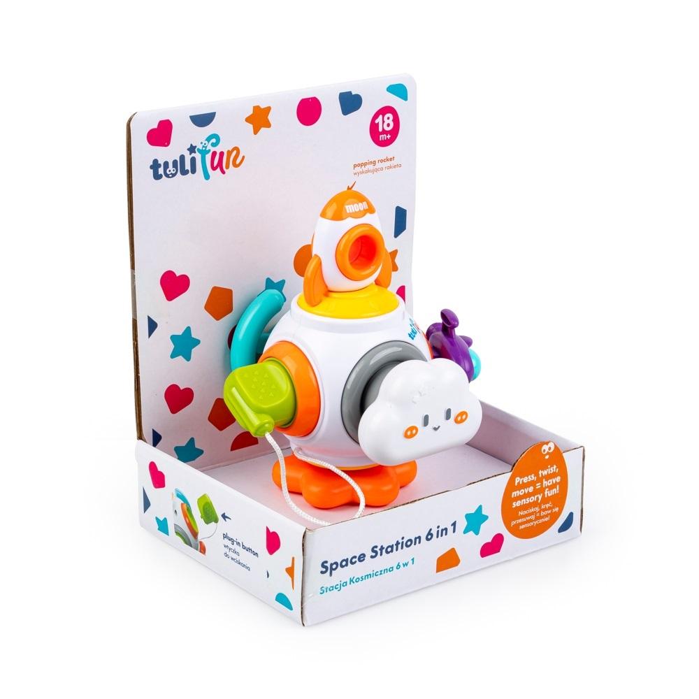 Misja kosmiczna ćwiczenie sprawności paluszków! Ta wielofunkcyjna zabawka wyposażona jest w wiele praktycznych zadań, z którymi dziecko może ćwiczyć motorykę małą. Znajduje się tu obrotowy ster, samolocik do przesuwania, wtyczka do wciskania, piszcząca chmurka, a także obrotowa gwiazdka, która jest zarazem ścianką, będącą podstawą zabawki. Po ustawieniu Stacji Kosmicznej na gwiazdce, można nią kręcić za pomocą paluszka. Kompaktowy rozmiar zabawki pozwala korzystać z niej zarówno w domu, jak i podczas podróży.