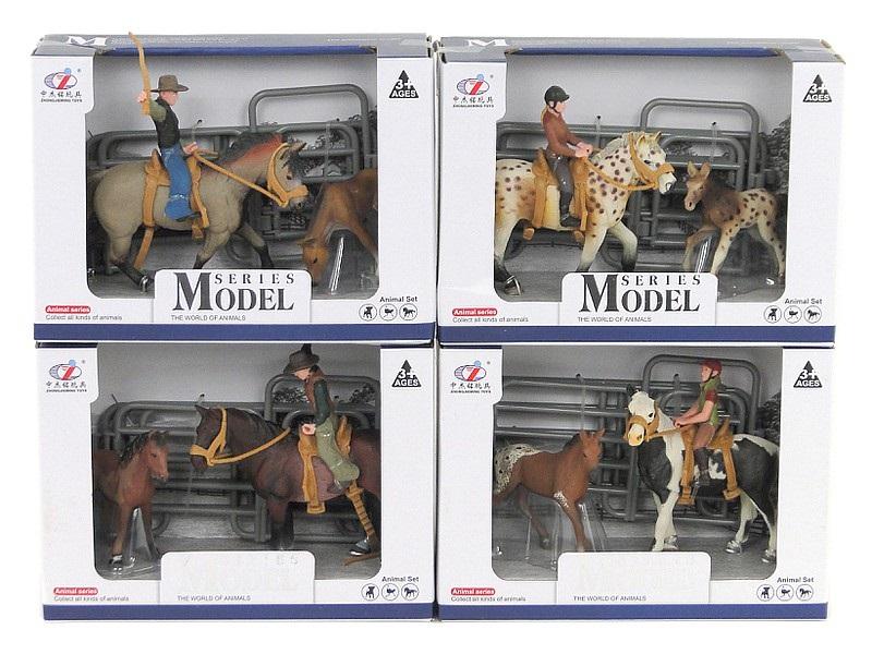zestaw stadnina, 2 konie, jeździec, zagroda, akcesoria; 23x10x16,5cm, W/B