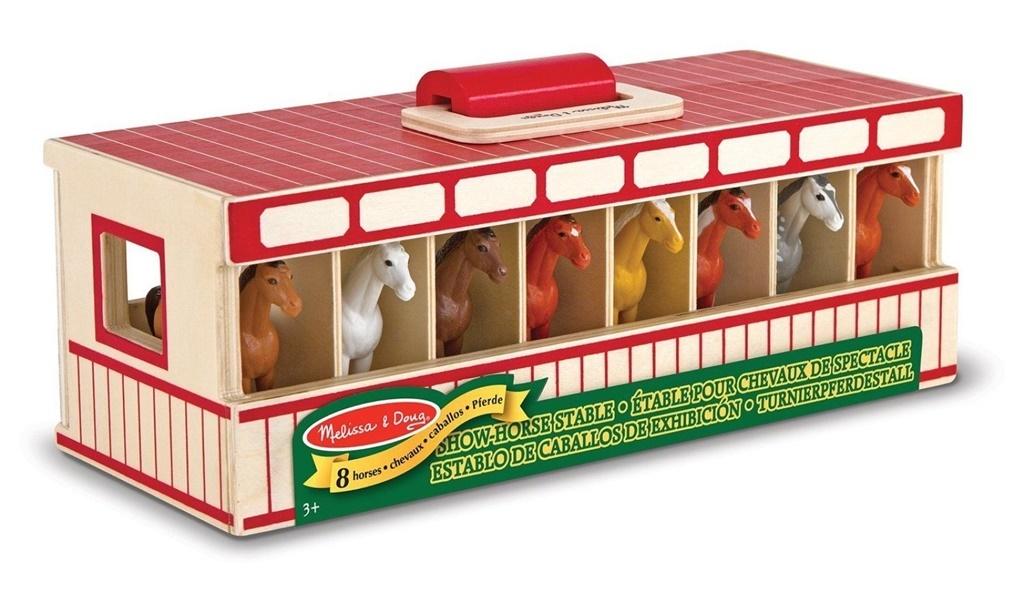 Zestaw dla miłośników koni. 8 różnych figurek koników, każdy mieszka w swoim boksie, całość stajni jest zamykana drzwiami. W zestawie znajdują się plakietki, aby zapisać imię dla każdego konia i umieścić je odpowiednio nad boksem. Wykonane z drewna, bardzo solidne opakowanie jest przenośne, dzięki wygodnej, metalowej rączce.
