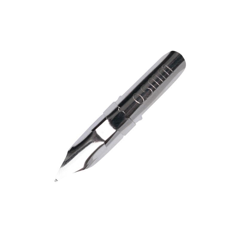 Stalówka redisówka do nasadki pióra maczanego. Zakończona okrągłą końcówką. Zostawia linię o grubości równej rozmiarowi okrągłej końcówki, czyli 0,5 mm.