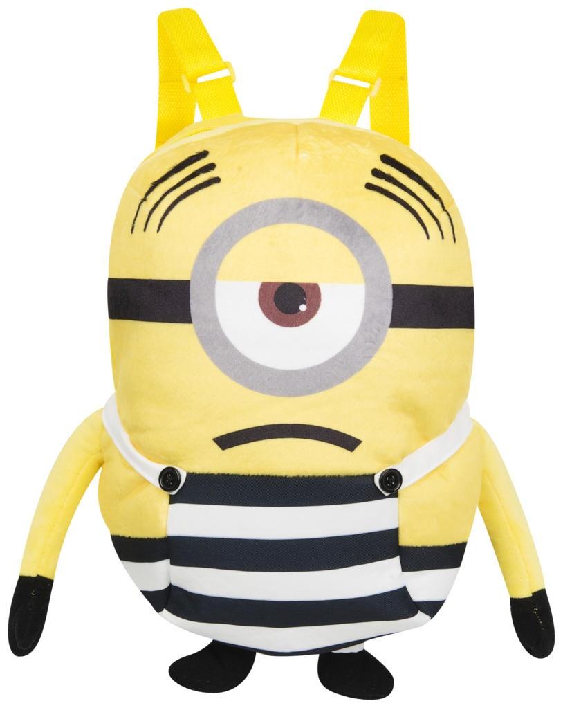 Plecak z postacią z filmu Minionki. Plecak wykonany z miękkiego materiału z dołączonymi rączkami oraz nóżkami Minionka. Plecak z jedną komorą zamykaną na suwak błyskawiczny, wymiar komory około: 30 x 20 x 15 cm