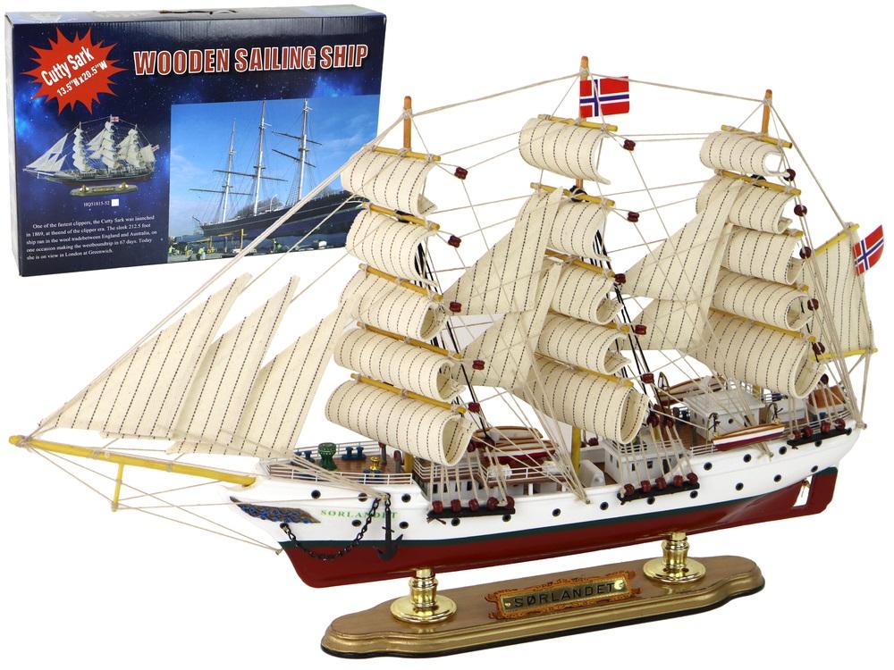 Statek Drewniany Kolekcjonerski Łódź Żaglowiec Okręt Model ten to statek żaglowiec "Sorlandet". Nazwa ta jest umieszczona na drewnianej podstawce, co dodaje autentyczności i umożliwia identyfikację tego konkretnego statku. Na samej górze żaglowca widoczna jest norweska flaga, co podkreśla pochodzenie statku oraz jego związek z Norwegią. Żagle tego modelu są imponująco rozwinięte i dodają żaglowcowi majestatycznego wyglądu. Są one białe z czarnym wzorem, co tworzy efektowny kontrast i podkreśla piękno żagli. Kadłub statku jest głównie w kolorach bordowo-białych, z zielonym paskiem, co nadaje mu wyjątkowy charakter i styl. To połączenie kolorów jest nie tylko estetyczne, ale także tradycyjne w żeglarstwie. Po bokach kadłuba widoczne są małe okna kajut, co dodaje realizmu i wskazuje na wnętrza statku, gdzie załoga mogła odpoczywać i pracować. Na bokach dziobu widoczne są kotwice, co jest typowym elementem żaglowców i odnosi się do ich funkcji w portach i na morzu. Na pokładzie statku widoczne są łodzie ratunkowe, które są kluczowym elementem bezpieczeństwa na morzu. Te detale dodają autentyczności i realizmu modelowi. Na kabinie nawigacyjnej znajdują się klaksony i światła ostrzegawcze, co wskazuje na jej ważną rolę w sterowaniu i prowadzeniu statku. Całość jest zapakowana w oryginalne pudełko z motywem statków, co nie tylko ułatwia przechowywanie, ale także czyni tę zabawkę idealnym prezentem dla miłośników żeglugi i kolekcjonerów. Ten model kolekcjonerski żaglowca Sorlandet to nie tylko piękna ozdoba, ale również hołd dla morskich tradycji i historii. Jest on doskonałym sposobem na eksplorację świata żeglugi i fascynującego życia na morzu. Zawartość zestawu : - Statek - Oryginalne pudełko Wymiary statku : 52 cm x 33 cm x 9 m Wymiary opakowania : 54 cm x 35 cm x 11 cm Statek posiada certyfikat CE. Przeznaczona jest dla dzieci powyżej 3 roku życia.