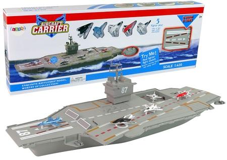 Statek Lotniskowiec Odrzutowce 5 szt Dźwięk Światła Ogromny lotniskowiec to idealny prezent dla fanów militariów i wojska. Łódź wraz z akcesoriami wojskowymi zachwyci każdego małego fana sprzętu wojskowego. Zestaw rozwinie wyobraźnie, kreatywność i pozwoli młodym żołnierzom na tworzenie planów bitewnych. Musisz sam to sprawdzić, ciekawa zabawka przeniesie Cię w świat morskiej armii wojskowej. Lotniskowiec z elementami wykonany jest z plastiku. Na pokładzie znajdują się przyciski, który uruchamiają efekty dźwiękowe i świetlne, słychać odgłosy strzelania, teraz możesz zestrzelić inne statki na swoim morzu. Syrena alarmująca, która uprzedza przed zagrożeniem. Długi okręt posiada ogromne lądowisko dla samolotów wojskowych. Stacjonując na morzu, resztę odrzutowców może wyruszyć na misję. Pokład podświetlany jest na kolor czerwony. Całość utrzymana jest w kolorystyce wojskowej. W statku znajdziemy podnoszony podest, można go unieść za pomocą pokrętła. Rozpocznij małą bitwę morską! Dodatkowo w zestawie znajdują się: - statek/ lotniskowiec - 5 odrzutowców Wymiary odrzutowców: 7 cm x 6 cm x 2 cm Wymiary łodzi wojskowej: 76 cm x 23 cm x 7 cm Wymiary opakowania: 77 cm x 28 cm x 8 cm Łódź podwodna zasilana jest dwoma sztukami baterii AG13 , które są dołączone do zestawu. Zestaw przeznaczony jest dla dzieci powyżej 3. roku życia. Zabawka posiada certyfikat CE i jest zgodna z normą EN 71. Zapakowana jest w kartonik, dzięki czemu nadaje się na prezent dla dziecka.
