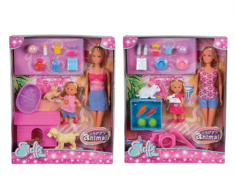 Lalki Steffi i Evi z kotami lub królikami, w zestawie z licznymi akcesoriami, 29cm, 12 cm, 2 rodzaje.