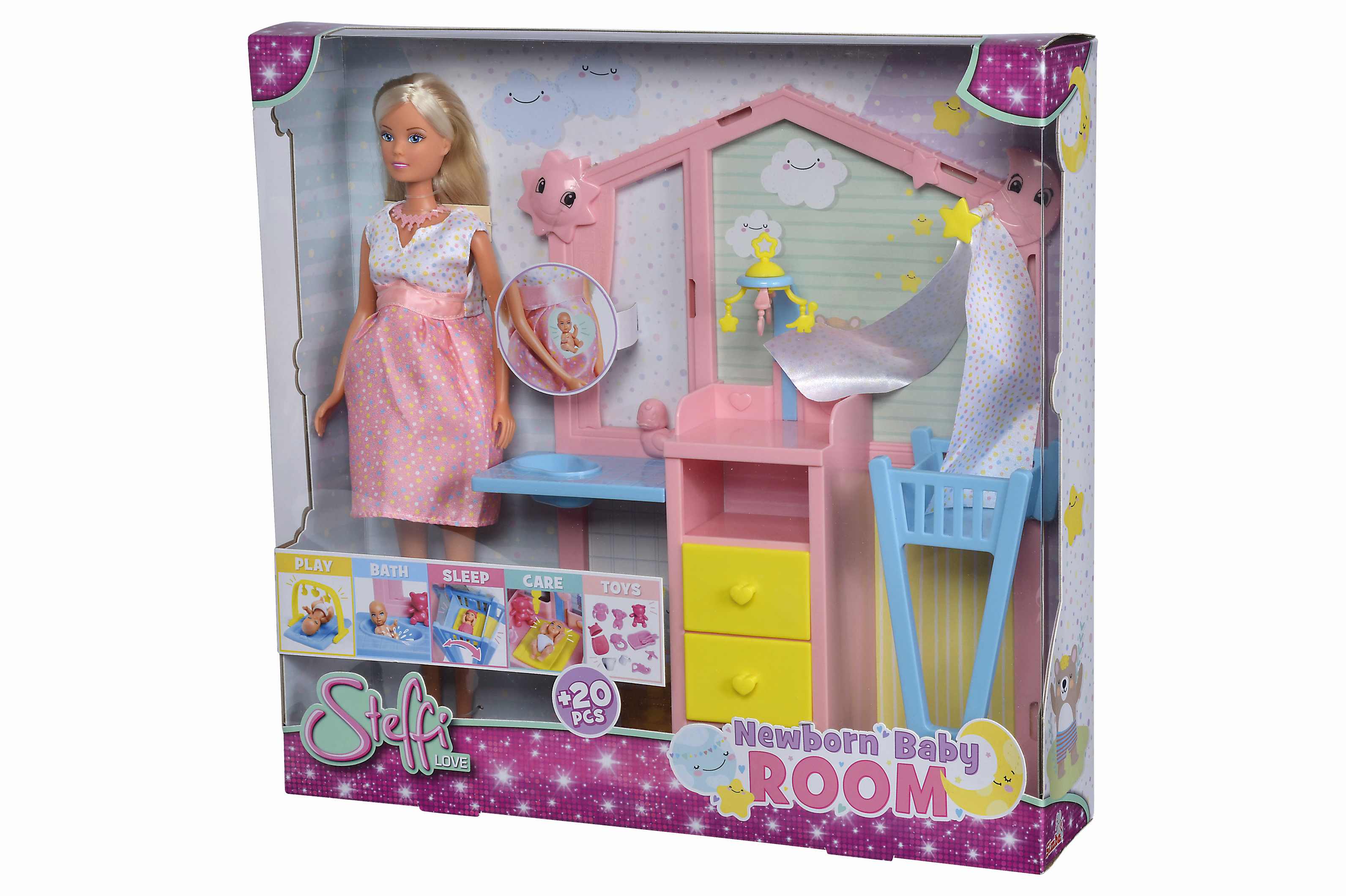 Steffi w ciąży z niemowlakiem w jego pokoju, jest tu kołyska, przewijak i wanienka oraz liczne akcesoria. Wysokość lalki: 29 cm.