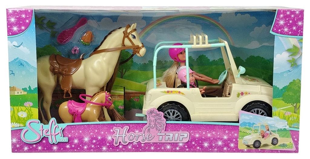 w zestawie; jeep, konie, lalka Steffi, lalka Evi, konie i akcesoria