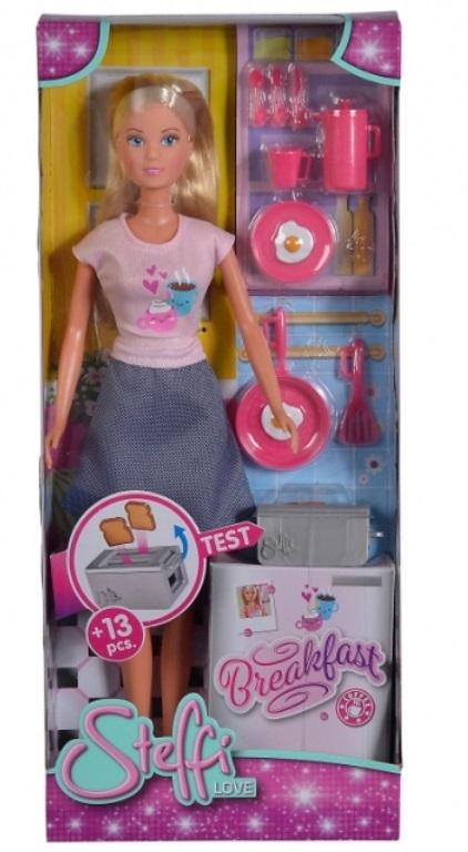 Różnorodne zestawy Steffi doskonale wpisują się w oczekiwania ciekawych świata dziewczynek. Zestaw Steffi przygotowuje śniadanie, zaopatrzony jest w odpowiednie akcesoria do przygotowania i spożycia porannego posiłku. Dołączony także toster z przyciskiem. Zabawa tym zestawem to świetna okazja do stawiania pierwszych kroków do współuczestniczenia w codziennych czynnościach. Zapewni wciągającą zabawę dla dziewczynek, które uwielbiają odgrywać role pełnione przez dorosłych.