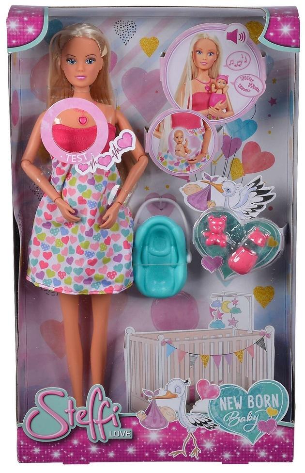 Steffi spodziewa się dziecka, mnóstwo zabawy dostarczą funkcje dźwiękowe lalki. Możemy wsłuchać się w bicie serca jeszcze nienarodzonego bobasa - wystraszy nacisnąć na naszyjnik lalki w kształcie serca. Podczas nadejścia bobasa na świat usłyszymy płacz dziecka zwiastujący jego zdrowie i szczęście młodej mamy - wystarczy ponownie nacisnąć na naszyjnik. Aby usłyszeć dźwięki rozbawionego noworodka w objęciach mamy czy uspokajającą kołysankę należy zamknąć brzuch przez przewrócenie wmontowanej zakładki i kolejno naciskać na naszyjnik. Lalka ma zginane w łokciach i nadgarstkach ręce, dołączone jest nosidełko i akcesoria do pielęgnacji noworodka, funkcja try-me, wysokość lalki: 29 cm, 3l+