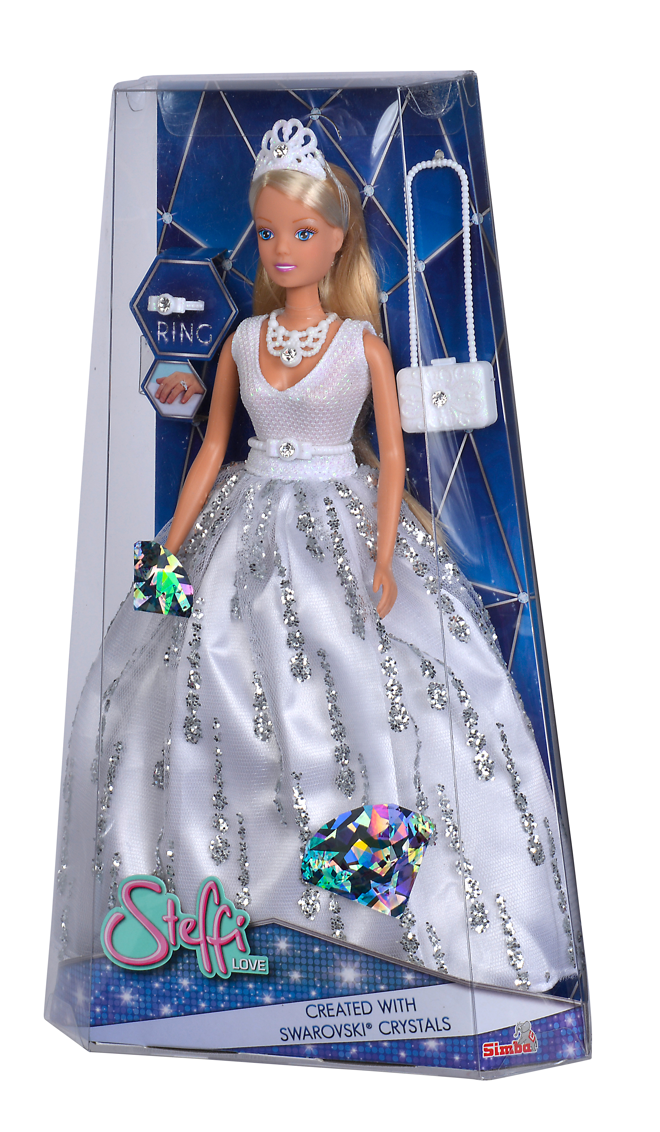 Steffi w śnieżnobiałej, długiej sukni uświetnionej kryształami Swarovskiego, luksusu dodają kryształki, które ozdabiają tiarę, pasek, naszyjnik i torebkę, dołączony pierścionek dla dziewczynki z kryształem Swarovskiego.