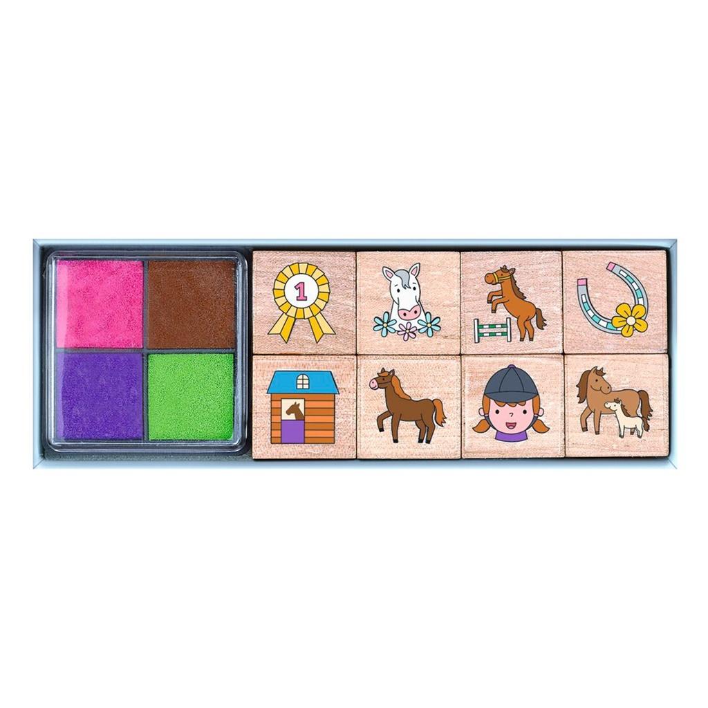 Drewniane stempelki przedstawiające konie na wyścigach to niezwykłe gadżety, które sprawią ogromną radość każdemu maluchowi, w wyjątkowy sposób rozwijają ich kreatywność. W zestawie znajdziemy 8 stempelków: konia w galopie, klacz ze źrebakiem, konia z grzywą, podkowę, konia zwycięzcę, medal, jeźdźca i stajenkę oraz 4 tusze: czerwony, zielony, brązowy i fioletowy. Drewniane stempelki z różnymi motywami są idealne do tworzenia listów, kartek, obrazków i ozdabiania prezentów. Wyobraźnia dziecięca nie zna granic.