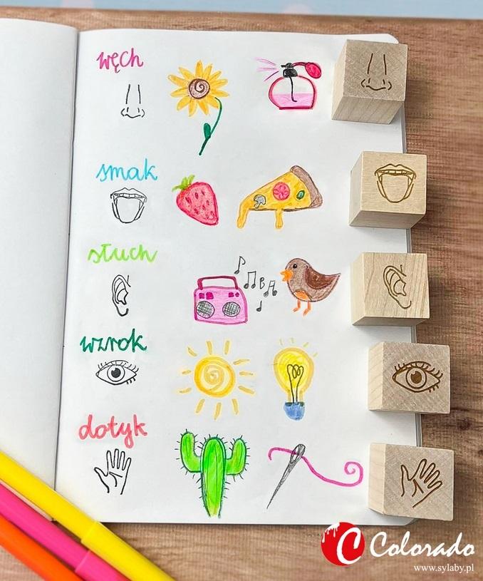 Z pomocą stempli dziecko nauczy się dopasowywać elementy otoczenia do danego zmysłu, np. kwiat- węch, słońce- wzrok, pizza- smak.