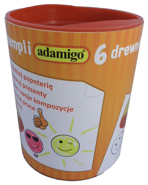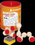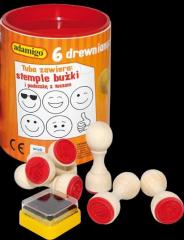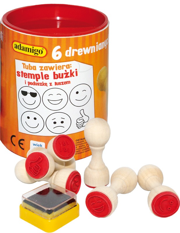 Zestaw 6 drewnianych pieczątek do kolorowania. W tubie oprócz stempli, znajduje się poduszka z tuszem. Kreatywna zabawa dla najmłodszych! Zabawka dla dzieci w wieku od 3 lat