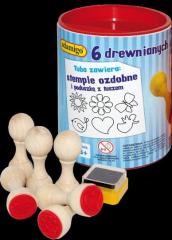 Zestaw 6 drewnianych pieczątek do kolorowania. W tubie oprócz stempli, znajduje się poduszka z tuszem. Kreatywna zabawa dla najmłodszych! Zabawka dla dzieci w wieku od 3 lat