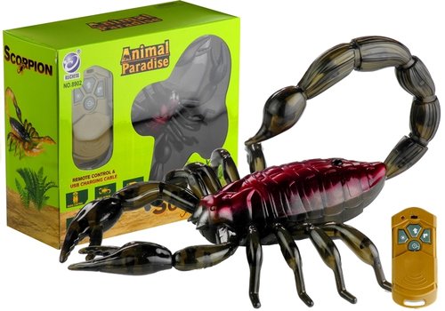 Bordowy skorpion zdalnie sterowany Uwaga, po Twojej podłodze chodzi skorpion! Spokojnie, to tylko zdalnie sterowana zabawka. Ciemnoczerwony skorpion będzie rewelacyjną zabawką dla wszystkich dzieci, które pasjonują się skorupiakami, a czasem lubią spłatać figle pozostałym domownikom. Zabawkowy skorpion wygląda bardzo realistycznie — jego bordowo-czarna skorupka, a także duże wymiary sprawiają, że wygląda jak prawdziwy. W zestawie poza zwierzątkiem znajduje się pilot i kabelek USB, umożliwiający ładowanie skorupiaka. Skorpion w swej spodniej części posiada przełącznik ON/OFF oraz port USB, a także kółeczka. Zabawka jest bardzo zwinna i sprytna — chodzi, potrafi obracać się o 360 stopni, a jej oczy świecą na różne kolory. Za sterowanie zabawki odpowiada dołączony do zestawu pilocik, zachowano go w naturalnej, ziemistej kolorystyce. Pilot zasilany jest 2 sztukami baterii AA 1,5 V. Posiada przełącznik, umieszczony w jego górnej części, a także cztery przyciski. Jak go obsługiwać? - strzałka: skorpion będzie poruszać się przed siebie, - strzałka odwrócona w prawo: skorpion odwróci się w prawo, - strzałka odwrócona w prawo, gdy skorpion porusza się naprzód: zabawka będzie odwracać się wokół własnej osi aż do momentu, w którym przestaniemy wciskać guzik, - przycisk demo: skorpion demonstruje wersję pokazową demo. Przycisk oznaczony kwadracikiem jest wolny — nie posiada żadnych funkcji. Po zakończonej zabawie może przesunąć element pod przyciskami, dzięki czemu będą one zabezpieczone, a zabawka nie zostanie włączona. Jest to bardzo pomocne zwłaszcza podczas podróży lub przenoszenia zabawki w plecaczku. Jesteśmy przekonani, że funkcja zdalnego sterowania skorpionem przyniesie każdemu dziecku ogrom radości. Jest to również doskonała okazja do oswojenia się z niecodziennymi zwierzętami, a także zamiennik dla prawdziwego mieszkańca domowego terrarium. Zabawkowy skorpion posiada certyfikat CE, a jego produkcja jest zgodna z obowiązującą normą EN 71. Zabawka przeznaczona jest dla wszystkich dzieci powyżej 6. roku życia, zapakowana jest w zielone pudełko z przeźroczystą witrynką, dzięki czemu rewelacyjnie nadaje się na prezent dla dziecka. Wymiary elementów zestawu: - skorpion: 17 cm x 13,5 cm, - pilot: 10 cm x 4 cm. Wymiary opakowania: - 19,5 cm x 17,5 cm x 8,5 cm.