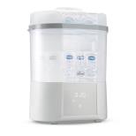 Sterylizator parowy z suszarką "All in one" Chicco dla szybkiej i skutecznej sterylizacji oraz suchych butelek i akcesoriów. W pierwszym roku życia rodzice poświęcają szczególnie dużo czasu i uwagi na czynności związane z karmieniem dziecka. Po skończonym posiłku należy zadbać o czystość butelek i akcesoriów do karmienia. Nieocenioną pomocą będzie odpowiednio dobrany sterylizator, dzięki któremu dbanie o higienę akcesoriów dla dziecka będzie wygodne, szybkie i bezpieczne. Sterylizator parowy z suszarką "All in one" Chicco: Jest wygodny i dostosowany do potrzeb. Sterylizacja odbywa się parą wodną co jest najbardziej naturalnym sposobem sterylizacji, nie wymagającym dodatkowych środków chemicznych Posiada 2 konfiguracje pozwalające na dostosowanie do potrzeb: pełnowymiarową oraz kompaktową. Użycie wersji kompaktowej zapewnia krótszy czas sterylizacji i mniejszy pobór prądu - do 25%. Wersja pełna zapewnia dużą pojemność - mieści aż do 6 butelek. Jest kompatybilny ze wszystkimi laktatorami, butelkami i akcesoriami do karmienia Chicco. Ceramiczna płyta grzewcza: zapobiega osadzaniu się kamienia wapiennego i efektowi palenia. Wymienny filtr do suszarki. Jest szybki i efektywny: Zapewnia efektywną sterylizację - eliminuje 99,9% szkodliwych zarazków, które występują w otoczeniu domowym. Jest szybki i łatwy w użyciu: sterylizuje w zaledwie 5 minut (bez czasu na rozgrzanie). Posiada trzy trybu pracy: sterylizacja; suszenie; sterylizacja z suszeniem w jednym cyklu. Automatycznie wyłącza się z sygnałem dźwiękowym po zakończeniu cyklu. Zapewnia 24-godzinną ochronę - gdy pokrywa jest zamknięta akcesoria pozostają zdezynfekowane. Funkcja opóźnionego startu do 2 godzin, zaplanuj sterylizację i/lub suszenie w dogodnym dla Ciebie terminie. Alert o konieczności odkamieniania - proces odkamieniania wykonuje się w prosty sposób przy użyciu wody i białego octu.