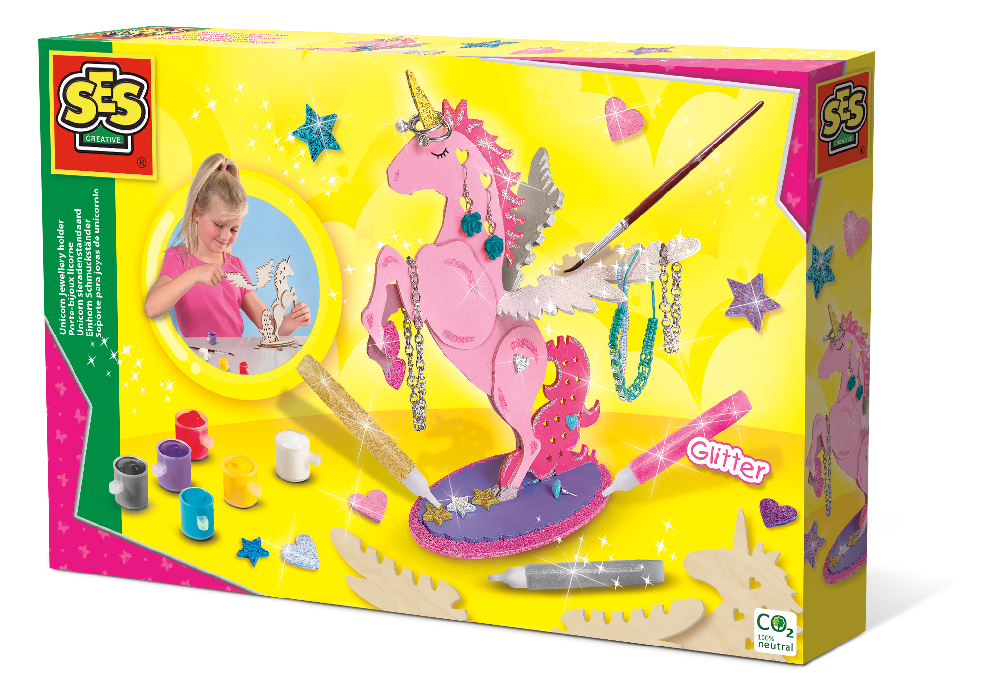 Chciałbyś wygodnie przechowywać całą swoją biżuterię w jednym miejscu i ją pięknie wyeksponować w swoim pokoju? Ten jednorożec ma poręczne otwory i krawędzie do zawieszenia pierścionków, kolczyków, bransoletek i naszyjników. Złóż drewniane części i pomaluj różnymi kolorami farby i kleju brokatowego! Jaki kolor jednorożca najlepiej pasuje do Twojego pokoju?