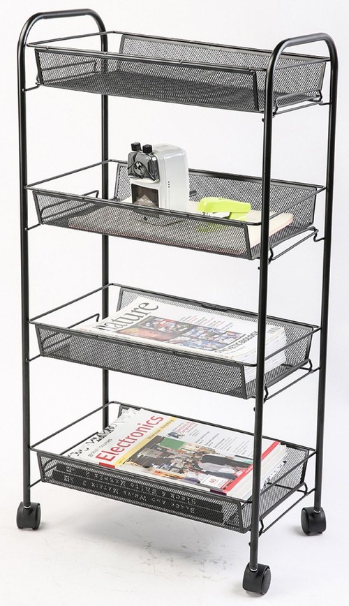 stojak na dokumenty lub akcesoria wykonany z metalowej siateczki powlekanej lakierem 4 półki wyposażony w cztery kółka kolor: czarny