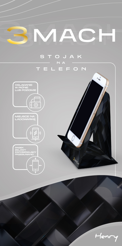 Stojak na telefon wykonany ze sztywnego kartonu. Telefon można stawiać w pionie i poziomie. Stojak pokryt matową folią soft touch zapobiegającą przesuwaniu się telefonu. Dodatkowo w zestawie znajduje się pasek żywiczny podtrzymujący telefon. Stojak do samodzielnego złożenia. Zapakowany z płaskie pudełko z otwieraniem na dole i euro zawieszką. Na odwrocie opakowania znajduje się instrukcja złożenia. Stojak posiada miejsce na podłączenie ładowarki.