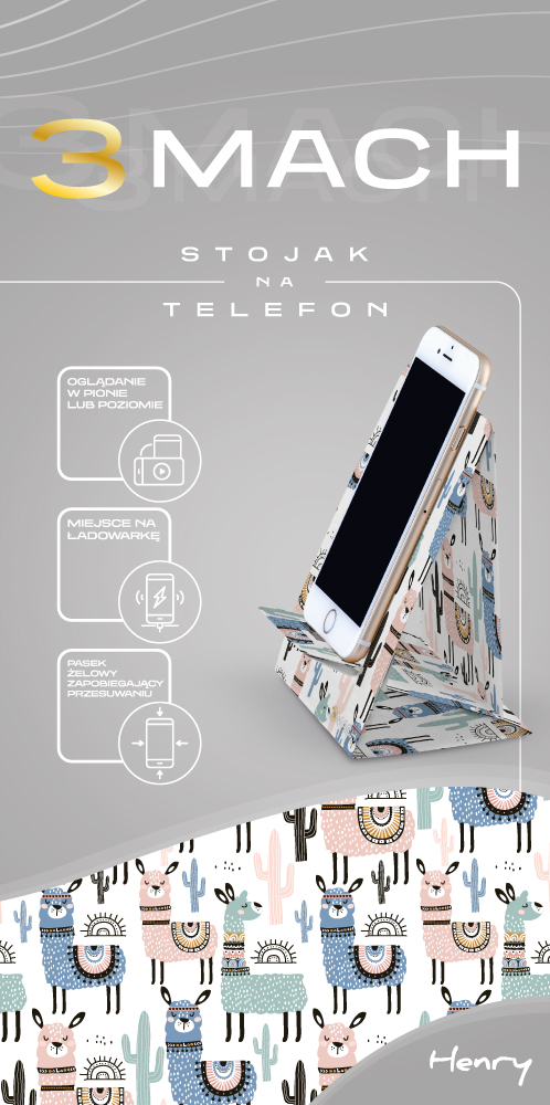 Stojak na telefon wykonany ze sztywnego kartonu. Telefon można stawiać w pionie i poziomie. Stojak pokryt matową folią soft touch zapobiegającą przesuwaniu się telefonu. Dodatkowo w zestawie znajduje się pasek żywiczny podtrzymujący telefon. Stojak do samodzielnego złożenia. Zapakowany z płaskie pudełko z otwieraniem na dole i euro zawieszką. Na odwrocie opakowania znajduje się instrukcja złożenia. Stojak posiada miejsce na podłączenie ładowarki.