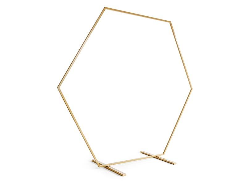 "Stojak na tło w kształcie heksagonu, wykonany z metalu w kolorze złotym, średnica po złożeniu ok. 2 m. Produkt łatwy w montażu, po złożeniu stanowi stabilną konstrukcję. Nadaje się do wielokrotnego użycia, idealny do profesjonalnego zastosowania. Stojak składa się z 8 elementów. Liczba elementów w kartonie: 8 części stojaka, 10 śrub do montażu, 2 klucze imbusowe oraz instrukcja. Wymiary kartonu: 40x20x80cm. Dokładne wymiary stojaka podane zostały na grafice pod zdjęciem produktu."