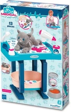Zestaw z 13 akcesoriami w tym: stół do pielęgnacji kota, koszyk do spania, pluszowy kot, prysznic, suszarka, nożyczki, szczotka, grzebień oraz miska z karmą. Wyprodukowane we Francji. Wymiary: 40 x 29 x 35 cm, 18 m+