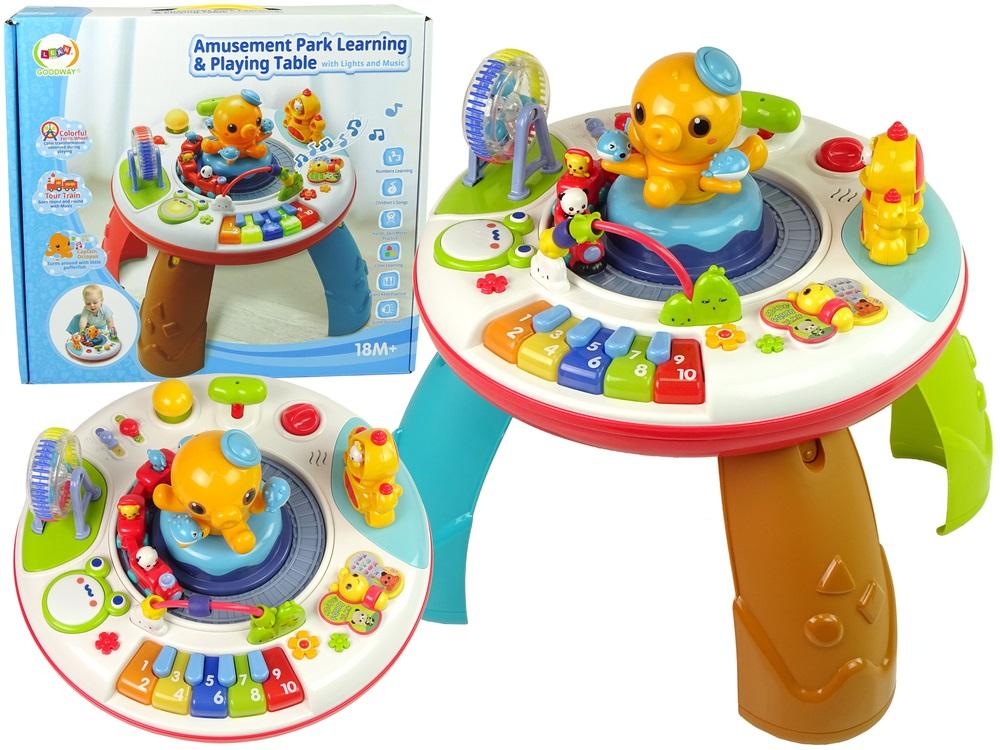 Interaktywny Stolik Edukacyjny Ośmiornica Pianinko Dźwięki Światła Interaktywny stolik z wieloma możliwościami to nie tylko pomysł na bardzo ciekawą zabawę, ale również niebanalny sposób na usprawnianie prawidłowego rozwoju maluszka. Zabawa rozwija Twoje dziecko wszechstronnie. Stymuluje słuch i wzrok malucha, a także pobudza jego zdolności manualne i zmysły. Dziecko poznaje wtedy otaczający świat oraz zdolność rozumienia świata, kształtów i kolorów. Biały blat stoliczka wyposażony jest w przyciągające wzrok dziecka elementy o różnych kształtach i kolorach. Na stoliczku znajdziemy przyciski w kształcie zwierzątek i kwiatków. Po ich naciśnięciu uruchamiają się wesołe dźwięki i efekty świetlne. Co skrywa w sobie ten interaktywny pulpit? - pianinko z melodyjkami i podświetleniem, - motylek z wesołymi melodyjkami, po przełożeniu skrzydełka uruchamiają się piosenki, które uczą liczenia i alfabetu w języku angielskim - pociąg z 3 wagonikami: panda, lew, słonik, poruszają się w kółko góra i dół w rytm muzyki, - żabka z podświetleniem i muzyką - piesek w pięknym zamku, naciskając na górę zamku, piesek wysuwa się w przód i słychać dźwięki fajerwerków - drążek, który uruchamia pociąg w przód i ma regulację w różnych prędkościach - diabelski młyn, który się obraca - ośmiornica, obracając się wokół, porusza swoim mackami, na których znajdują się małe rybki Cały stoliczek ustawiony jest na czterech kolorowych nóżkach. Ciepła kolorystyka i muzyka zachęci dziecko do zabawy, rozwijając też jego zdolność koncentracji. Wiele bodźców wpłynie pozytywnie na malucha. Wszelkie efekty dźwiękowe, takie jak wesołe piosenki i melodyjki będą stymulować zmysły malucha. Stolik edukacyjny jest bardzo prosty zarówno w montażu, jak i demontażu. Wymiary stoliczka: Średnica blatu: 42 cm Wysokość: 33 cm Wymiary opakowania: 50 cm x 45 cm x 14 cm Zabawka przeznaczona jest dla dzieci powyżej 18 miesiąca roku życia. Zasilany 3 sztukami baterii 1,5 V AA, które umieszcza się w spodniej części blatu.