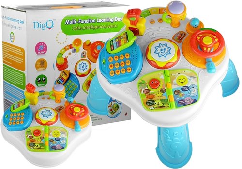 Wielofunkcyjny stolik edukacyjny dla malucha 5 w 1 Stolik edukacyjny jest zabawką, którą powinien mieć każdy maluszek. Interaktywna zabawka z wieloma aktywnościami to nie tylko pomysł na bardzo ciekawą zabawę, ale również niebanalny sposób na usprawnianie prawidłowego rozwoju maluszka. Stolik składa się z przyjemnych dla oka, jasnych i neutralnych kolorów, dzięki czemu będzie idealny zarówno dla chłopca, jak i dziewczynki. Elementy, które można podnosić, z pewnością zainteresują każde dziecko, ucząc równocześnie, jak używać swych rączek, by dotykać tego, co widzą ich oczka. Dziecięcy, funkcjonalny design zabawki sprawi, że element ten będzie dekorację każdego pokoiku malucha. Co znajduje się na blacie stolika edukacyjnego? - włącznik ON/OFF, uruchamiający zabawkę, a także pozwalający na wybranie języka angielskiego bądź hiszpańskiego. Jeśli po 30 sekundach od włączenia stolika nie wybierze się języka, zabawka będzie automatycznie działać w zapisanym, poprzednim języku, - telefon komórkowy — po podniesieniu dziecko usłyszy dźwięki przypominające wybieranie numeru, a także dźwięki zwierzątek i muzykę. Za każdym razem, gdy maluch podniesie słuchawkę, usłyszy innego zwierzaka — jest ich pięć, - klawiaturka z aktywnymi przyciskami, - książeczka z trzema przekładanymi stronami — pierwsza z literkami i wesołą, dziecięcą piosenką, druga ze zwierzątkami i małymi insektami, które budzą się ze snu zimowego, by bawić się. Różnorodność zwierzątek sprawi, że dziecko nauczy się je rozpoznawać, a także opisywać aktywności, które uprawiają, trzecia strona zapowiada lato, przedstawia zwierzaki, które żyją na plaży i w wodzie. By urozmaicić ten element, należy wcisnąć czerwony guziczek, aktywujący wesołe melodie, - mała kierownica, którą można obracać o 360 stopni, połączona jest z klaksonem znajdującym się w jej centralnej części, a także kierunkowskazem i dźwignią biegów. Zabawka ta wydaje dużo ciekawych dźwięków, których poziom głośności zmienia się w zależności od tego, jak dziecko porusza kierownicą, - trąbka z przyciskiem, który włącza jedną z trzech melodii, - malutka gitara z elementem wypełnionym groszkiem, którego wciśnięcie aktywuje jedną z trzech gitarowych melodii, - pianinko DO-RE-MI-FA-SO, z dwoma przyciskami — nutką, skrywającą pod sobą 10 piosenek, klawiszami, grającymi jak pianino, harmonia, skrzypce, saksofon. Wybranie każdego z przycisków sprawia, że pianinko gra w innej skali, - bębenek umieszczony w centralnej części panelu. Zabawa z wykorzystaniem tego rewelacyjnego, wielofunkcyjnego stolika dla malucha posiada same zalety. Wpływa na rozwój paluszków i dłoni dziecka, zachęca również do samodzielnego stania i podejmowania prób stawiania małych kroczków. Liczne efekty dźwiękowe stymulują słuch dziecka, natomiast przeróżne kolory i kształty aktywizują wzrok dziecka. Montaż wielofunkcyjnego stolika jest bardzo prosty. Obrazkowa instrukcja składa się z kilku kroków, została umieszczona na opakowaniu zabawki. Edukacyjny stolik został zaprojektowany z myślą o dzieciakach, które osiągnęły 18. miesiąc życia. Dostosowano do nich wymiary zabawki i jej poszczególnych elementów, a także zadbano o to, by konstrukcja była pozbawiona ostrych i niebezpiecznych zakończeń. Stolik opiera się na nóżkach rozstawionych po każdej stronie blatu, co jest gwarancją dużej stabilności i wygody użytkowania. Przedmiot posiada certyfikat CE, świadczący o spełnieniu wymaganych norm, zapakowany jest w estetyczne pudełko z rączką ułatwiającą przenoszenie zabawki. Wymiary stolika: - 36 cm x 38 cm. Wymiary opakowania: - 20,5 cm x 37 cm x 37 cm.