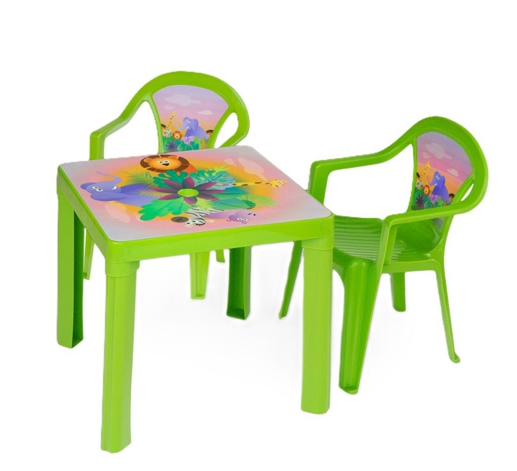 Zestaw: stolik i dwa krzesła, kolor Seledyn, wtopiona etykieta IML z kolorowym motywem w blat stolika i oparcie krzesła uniemożliwa jego odklejenie i gwarantuje wysoką odporność na warunki atmosferyczne, do stosowania zarówno na zewnątrz, jak i wewnątrz
