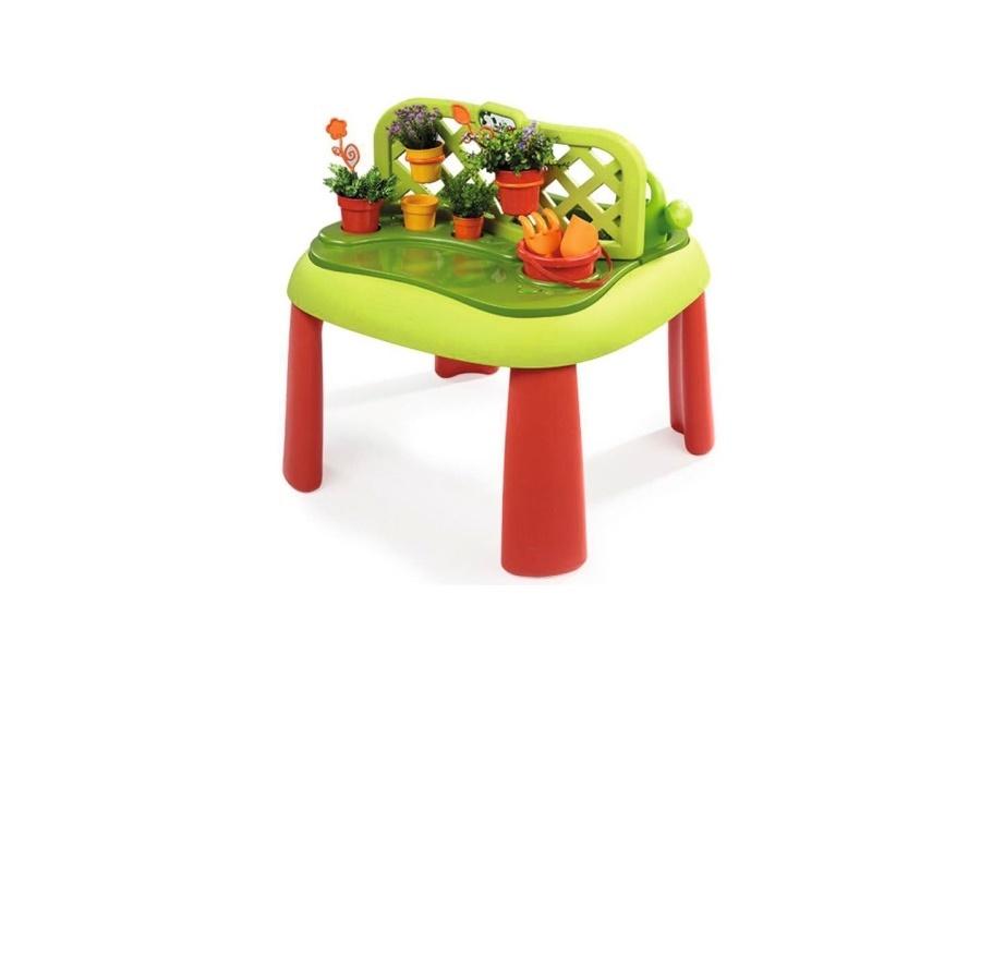 Stolik ogrodowy do zabawy 840100 to nowa koncepcja zabawy na świeżym powietrzu, w ogrodzie, czy na balkonie. Dzieci mają do dyspozycji uroczy stolik przedzielony małą pergolą. W jednaj części blatu znajduje się miejsce na narzędzia i doniczki, z drugiej zaś - donica w formie kuwety, w której mali ogrodnicy mogą sadzić swoje pierwsze roślinki. W zestawie znajduje się 5 różnych doniczek, 2 uchwyty do zawieszenia roślin na pergoli, wiaderko, konewka, łopatka i grabki, a także 4 dekoracje, wkładane do ziemi w doniczkach. Blat stolika wsparty jest na szerokich, stabilnych nogach. Stolik utrzymano w naturalnych barwach - różne odcienie zieleni i czerwieni, co sprawia, że sam w sobie stanowi ciekawy element zdobniczy ogrodu, czy placu zabaw. Plastik pokryto powłoką ANTI-UV - zapobiegającą blaknięciu kolorów. Wymiar stolika to 69 x 69 x 70
