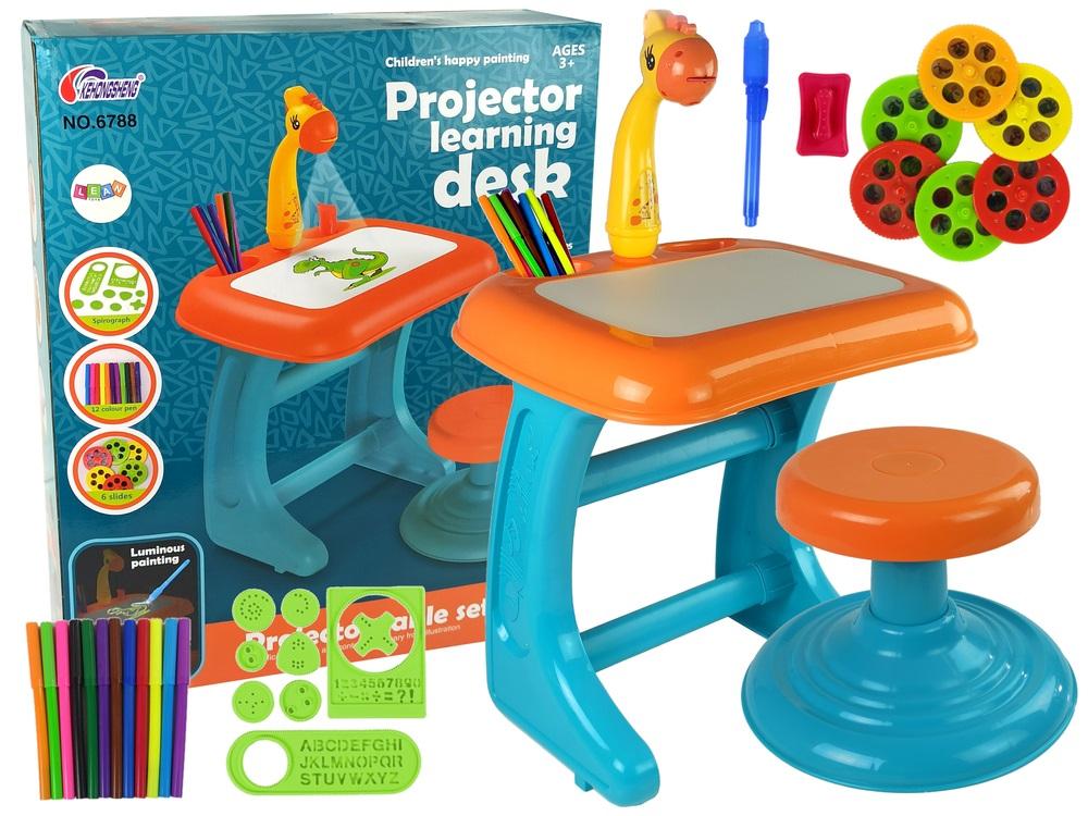 Stolik Tablica Do Rysowania Krzesełko Projektor Pomarańczowy Pisaki Obrazki Wielofunkcyjna tablica z możliwością pisakami sprawi radość każdemu malcowi, który uwielbia rysować. Rozwinie w nim zmysł plastyczny, wyobraźnie oraz funkcje ręki i dokładność. Rysowanie na tablicy bardzo pozytywnie wpłynie na rozwój dziecka. W skład zestawu wchodzi także mały taborecik, za pomocą którego Twoje dziecko będzie w stanie wygodnie siedzieć przy stoliku. Zarówno siedzisko, jak i stolik są utrzymane w różowych barwach, będzie idealnym uzupełnieniem wystroju pokoju dziecięcego. Na blacie stolika znajdują się dwie małe szufladki, w których można chować pisaki w pełnej gamie kolorów, są zawsze w zasięgu ręki. Projektor umieszczony na środku stolika przypomina wyglądem przyjazną żyrafę. Wyświetla najróżniejsze obrazki ze zwierzątkami oraz postaciami, które można przerysować na kartkę. Szablony w zestawie nauczą Twoje dziecko odpowiednich nazw figur geometrycznych oraz pisania literek. Wiele korzyści i zabawy! Elementy zestawu: - projektor - 36 szablonów obrazków, - 6 dysków z obrazkami, - 12 kolorowych pisaków, - szablon z figurami geometrycznymi - szablon z literami - pisak, który po podświetleniu pokaże co narysowałeś Wymiary stolika: 44 cm x 36 cm x 45 cm Wymiary blatu do rysowania: 32 cm x 21 cm Wysokość od podłogi do blatu: 45 cm Wysokość projektora: 23 cm Wymiary krzesełka: 30 cm x 20 cm Wymiary opakowania: 42 cm x 50 cm x 14 cm Projektor zasilany jest 4 sztukami baterii AA 1,5 V, które nie są dołączone do zestawu. Natomiast pisak - trzema LR41, dołączone do zestawu. Umieszcza się je w projektorze, dzięki czemu może prawidłowo działać. Zabawka wykonana jest z bezpiecznych, atestowanych materiałów, które wpływają na długą żywotność zabawki oraz jej solidność. Stolik opiera się na nóżkach, których wysokość dostosowana jest do średniego wzrostu maluchów. Wszelkie elementy znajdujące się w zestawie posiadają certyfikat CE. Stolik z projektorem zapakowany jest w duże, kolorowe pudełko, pomagające w przenoszeniu zabawki.