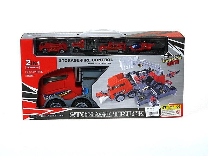 auto strażackie - baza transportowa, z podnośnikiem i wyrzutnią autek, 3 pojazdy metalowe; 40,5x10x19,5cm, W/B